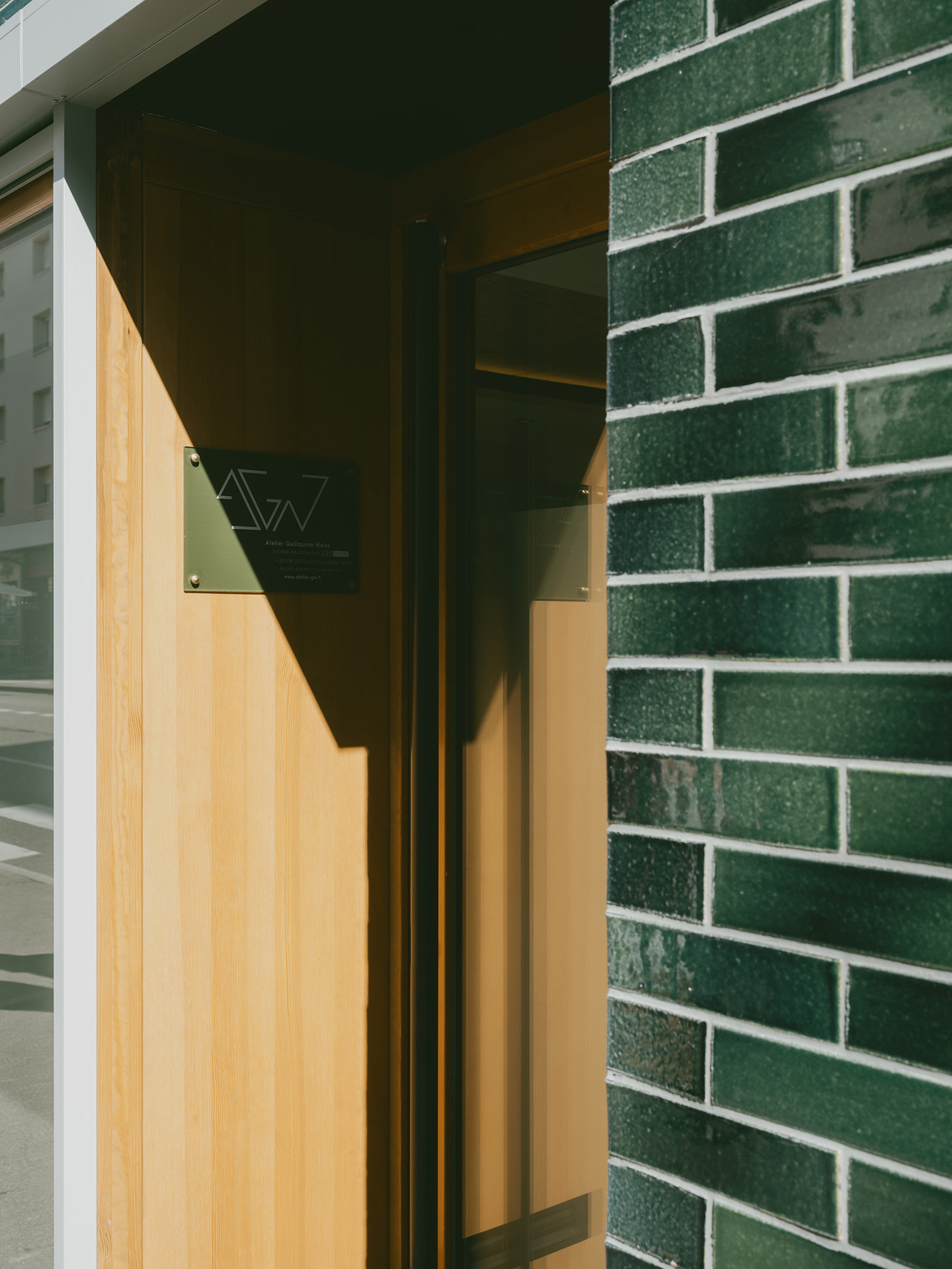 L'atelier est situé au centre-ville et en bordure du site patrimonial remarquable, un soin particulier a donc été apporté au traitement de sa façade sur rue, avec l'emploi de plaquettes de terre cuite émaillées tricolores et la mise en œuvre de menuiserie bois finition mélèze.