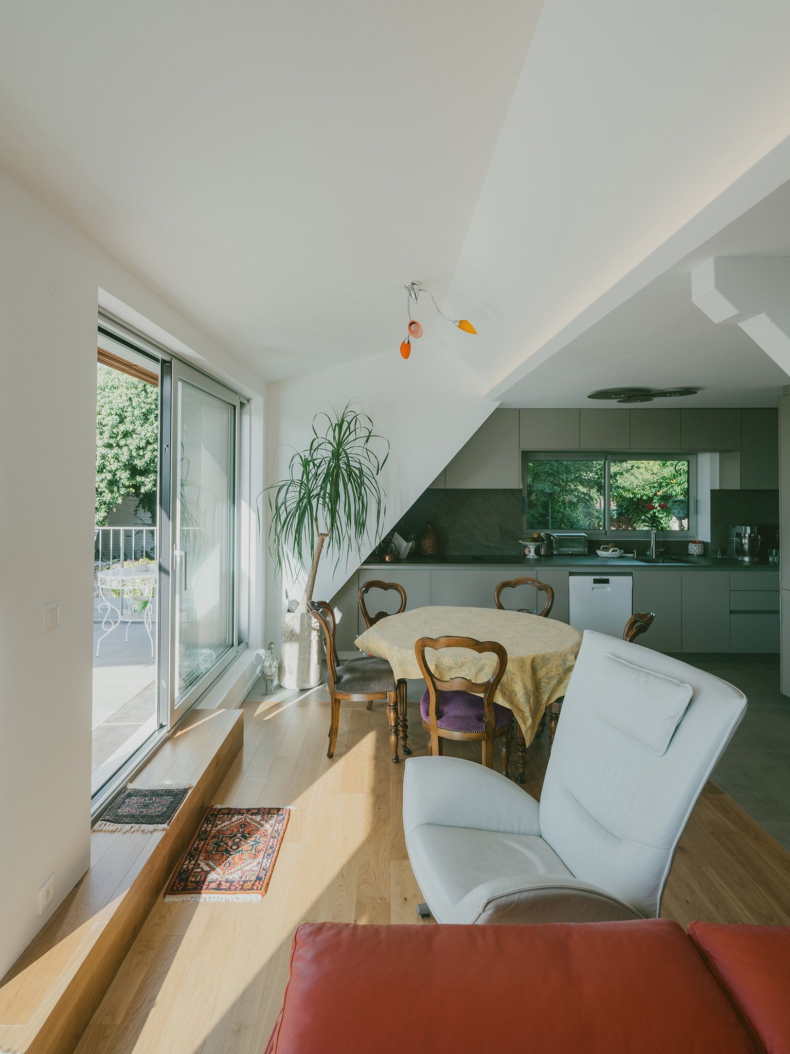 L'extension au rez-de-jardin et la lucarne rampante du rez-de-chaussée sont réalisées en ossature bois. Le socle de maison est revêtu d'un enduit naturel similaire à l'existant tandis que l’élément de toiture est habillé de tôle en cuivre.